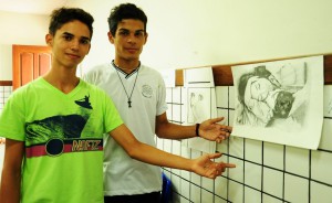 Isaac Nicolas Lima dos Santos e Eduardo Felipe de Carvalho são dois dos alunos/artistas que tiveram suas obras expostas. Nas paredes da sala, foram afixados desenhos que retratam os laços afetivos e o convívio entre mães e filhos, feitos pelos dois e que surpreendeu os visitantes. “Pensamos neste tema por conta do Dia das Mães. Nas pinturas e desenhos buscamos destacar a expressão e o carinho entre mães e filhos. Primeira vez que expomos nosso trabalho e está sendo muito gratificante ser na escola e ver a reação das pessoas que olham e dizem que está lindo”, disse Isaac.